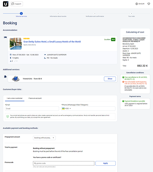 Online payment is credited to the account of the Unit.Travel trading platform, where the payment is automatically split, thus part of the amount goes to the supplier, and the balance is held for the travel manager until the date of service delivery.