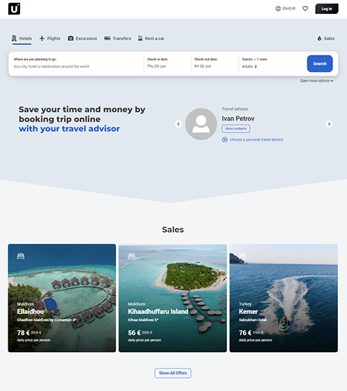 We provide travel agents with a free B2C website with the possibility of online booking of travel services and providing remote support
